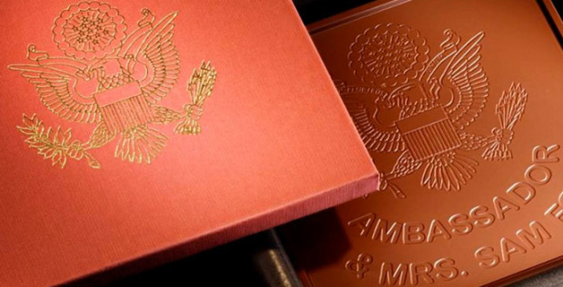Presidentiële chocolade relatiegeschenken gemaakt voor diverse Amerikaanse Ambassadeurs waaronder US Ambassador Rivkin in Parijs, Denise Bauer in Brussel, bedrukt met de “Great Seal” van Verenigde Staten van Amerika, als een einde jaars geschenk, vond zijn weg tot in het witte huis.